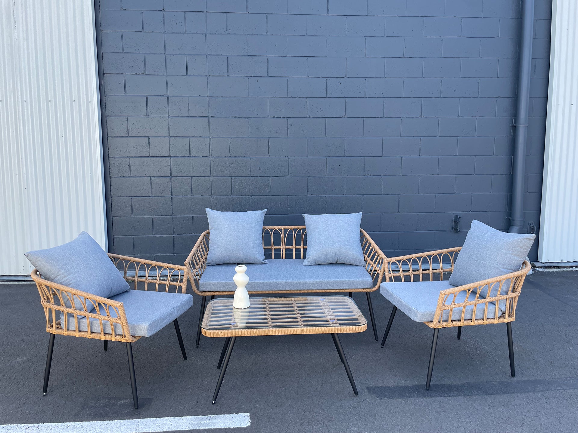 The Goulburn 4 Piece Outdoor Sofa Set blends rustic charm with modern design, featuring natural rattan weave and sleek black legs for a stylish outdoor look. The grey cushions add contrast, enhancing the aesthetic of any patio or garden.