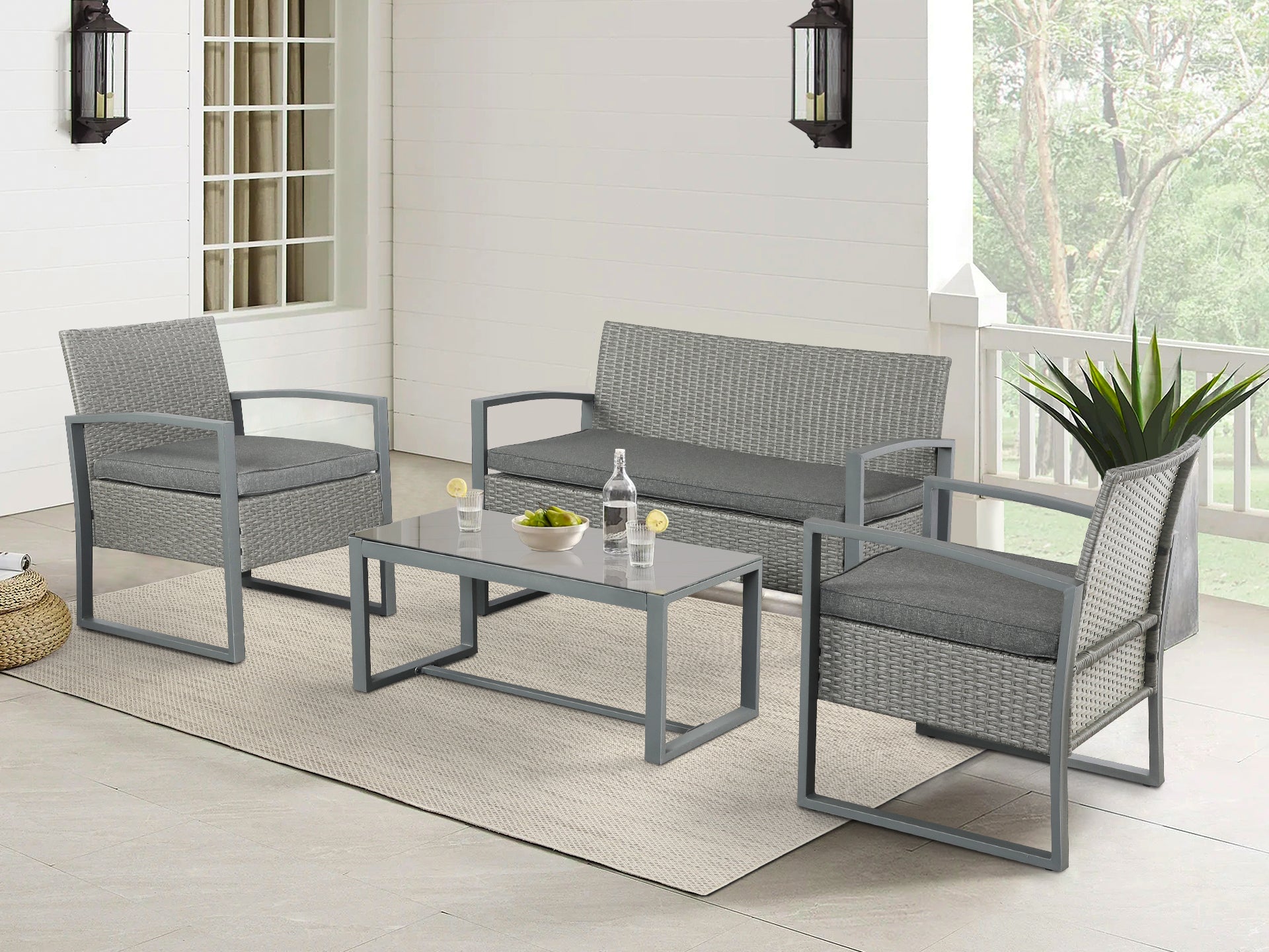 This outdoor furniture set is made of high-quality waterproof synthetic rattan compiled on a metal frame with a grey finish, which not only creates a contemporary and elegant style but is also durable and waterproof to withstand moderately variable weather. Both the chairs and sofa provide strong support while giving you a magical experience of comfort and lightness. This outdoor furniture set comes with an exquisite coffee table, meeting your various needs, whether it is an afternoon break, entertaining visitors, or arranging waiting areas, lobby and other scenes. Kick up your feet or rest a tray of drinks on the table's smooth glass surface to enjoy a quiet relaxing time with your family or friends in the courtyard.